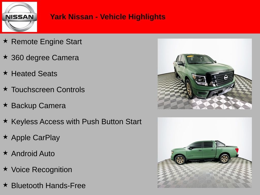 Certified. Recent Arrival! 2024 Tactical Green Metallic Nissan Titan SV 4WD Remote Engine Start, 360 degree Camera, Heated Seats, Touchscreen Controls, Backup Camera, Keyless Access with Push Button Start, Apple CarPlay, Android Auto, Voice Recognition, Bluetooth Hands-Free, 120V/12V Outlets In Back Of Center Console, 2 Illuminated USB-A Ports In Back Of Center Console, Auto-Dimming Rear-View Mirror, Dedicated Cell Phone Holder, Dual Illuminated Vanity Mirror Front Sun Visors, Dual Zone Automatic HVAC, Front & Rear Parking Sensors, Heated Front Captain's Chairs, Intelligent Key System, Leather-Wrapped Steering Wheel, Mood Light, NissanConnect Services, Overhead Console w/Sunglass Holder, Power Sliding Rear Window w/Defogger, Rear HVAC Vents, Remote Engine Start System, SV Convenience Package, Wi-Fi Hotspot.