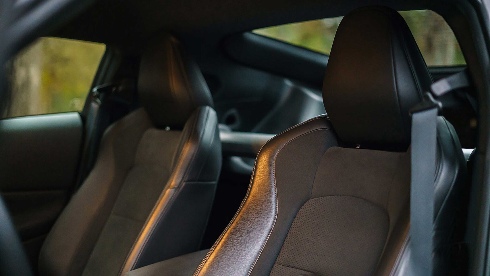 Inside the 2026 Nissan Z, drivers discover a cockpit designed for performance and comfort. The two-passenger cabin features multiple seating options across the trim levels, from woven cloth in the Sport model to leather-appointed seats in the Performance trim and exclusive Alcantara in the NISMO variant. The Performance trim's heated front bucket seats include four-way power adjustment for both driver and passenger, along with manual lifter, lumbar and thigh support for the driver near Ann Arbor.