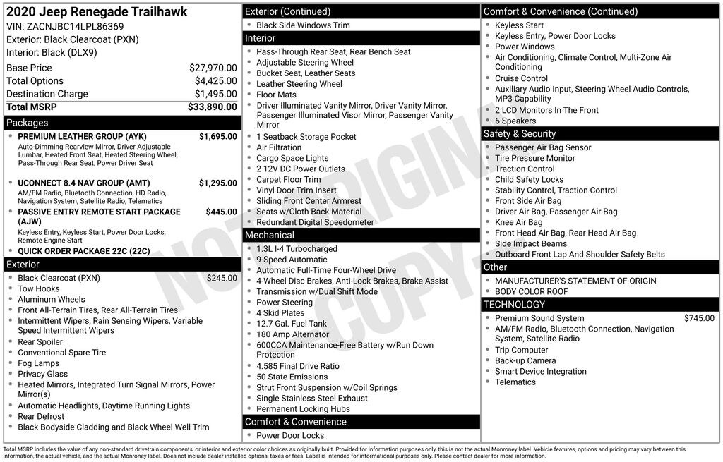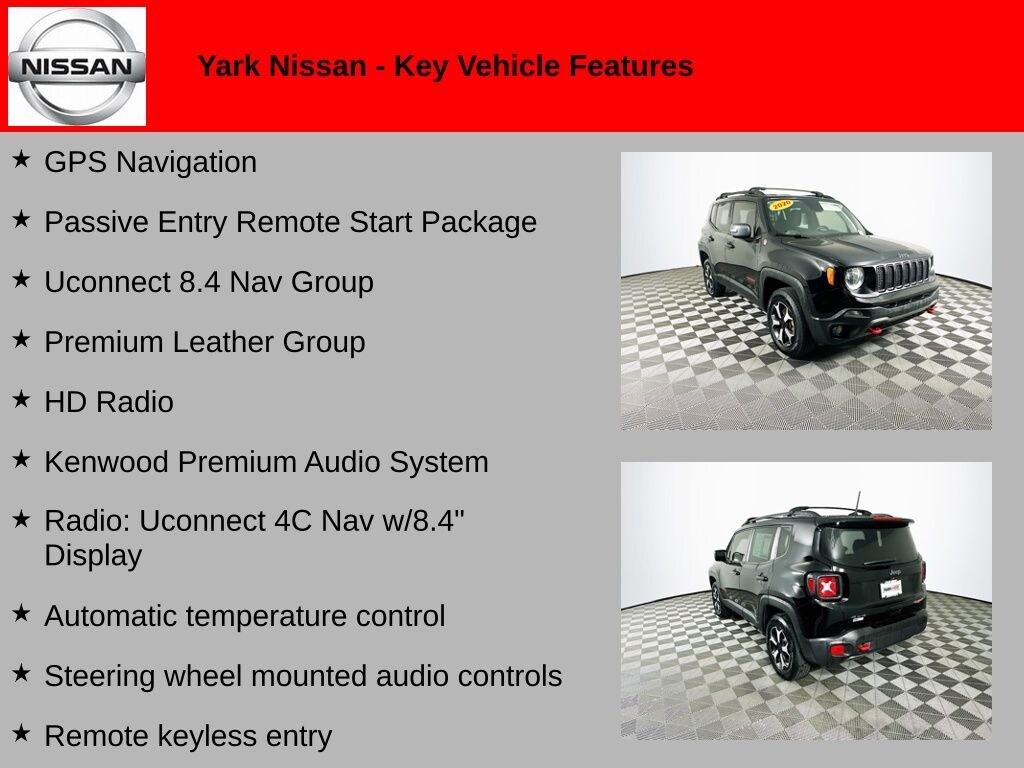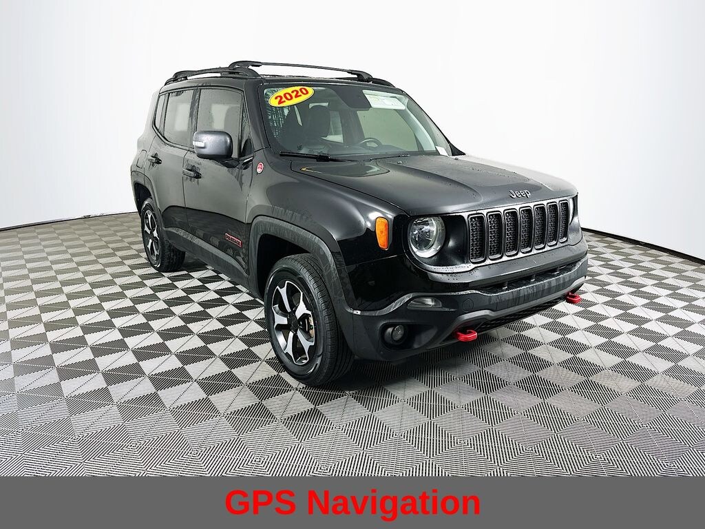 Recent Arrival! 2020 Black Clearcoat Jeep Renegade Trailhawk 4WD 40/20/40 Rear Seat w/Trunk Pass-Thru, 8.4" Touchscreen Display, Apple CarPlay/Android Auto, Auto-Dimming Rear-View Mirror, Automatic temperature control, For Details, Visit DriveUconnect.com, Front Seat Back Map Pockets, Fully automatic headlights, GPS Navigation, HD Radio, Heated Front Seats, Heated Steering Wheel, Kenwood Premium Audio System, Keyless Entry w/Panic Alarm, Manual Adjust 4-Way Front Passenger Seat, ParkView Rear Back-Up Camera, Passive Entry Remote Start Package, Power 4-Way Driver Lumbar Adjust, Power Adjust 8-Way Driver Seat, Premium Leather Group, Premium Leather Trimmed Bucket Seats, Radio: Uconnect 4C Nav w/8.4" Display, Remote keyless entry, SiriusXM Traffic Plus, SiriusXM Travel Link, Steering wheel mounted audio controls, Uconnect 8.4 Nav Group, Windshield Wiper De-Icer.