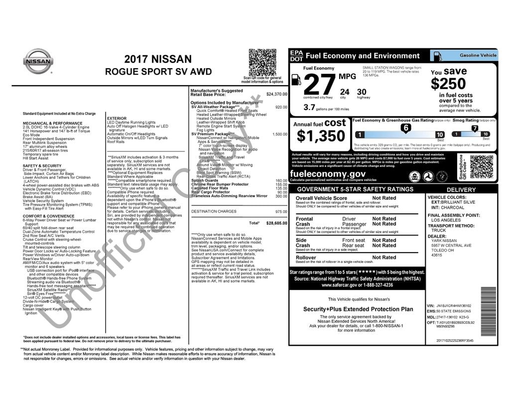 Sirius XM|SV All-Weather Package|SV Premium Package|6 Speakers|AM/FM radio: SiriusXM|CD player|Radio data system|Radio: AM/FM/CD/AUX|Radio: AM/FM/CD/AUX NissanConnect w/Navigation|Air Conditioning|Automatic temperature control|Front dual zone A/C|Rear window defroster|Power driver seat|Power steering|Power windows|Remote Engine Start System|Remote keyless entry|Steering wheel mounted audio controls|Four wheel independent suspension|Traction control|4-Wheel Disc Brakes|ABS brakes|Dual front impact airbags|Dual front side impact airbags|Front anti-roll bar|Low tire pressure warning|Occupant sensing airbag|Overhead airbag|Rear anti-roll bar|Chrome Rear Bumper Protector|Blind Spot Warning|Brake assist|Electronic Stability Control|Delay-off headlights|Fully automatic headlights|Panic alarm|Security system|Speed control|Black Splash Guards (Set of 4)|Bumpers: body-color|Fog Lights (X01)|Heated Outside Mirrors|Power door mirrors|Roof rack: rails only|Spoiler|Turn signal indicator mirrors|Around View Monitor w/Moving Object Detection|Carpeted Floor Mats|Cloth Seat Trim|Driver door bin|Driver vanity mirror|Frameless Rear View Mirror w/UGDO|Front reading lights|Heated Leather Wrapped Steering Wheel|Illuminated entry|Leather-Wrapped Shift Knob|NissanConnect Services Powered By SiriusXM|Outside temperature display|Overhead console|Passenger vanity mirror|Quick Comfort Heated Front Bucket Seats|Rear Cargo Protector (2-Pc Carpet)|Rear seat center armrest|Tachometer|Telescoping steering wheel|Tilt steering wheel|Trip computer|Front Bucket Seats|Front Center Armrest|Split folding rear seat|Passenger door bin|Alloy wheels|Wheels: 17in x 7.0in Aluminum Alloy|Rear window wiper|Speed-Sensitive Wipers|Variably intermittent wipers|TBD Axle Ratio