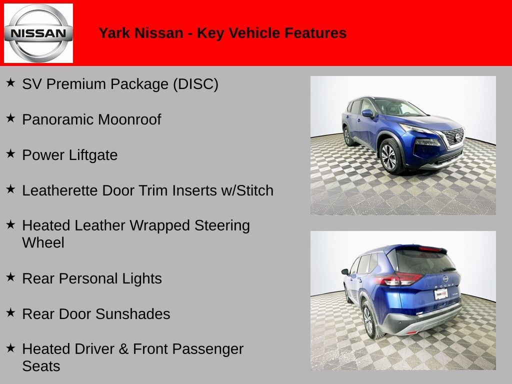 Recent Arrival! 2023 Caspian Blue Metallic Nissan Rogue SV AWD Heated Driver & Front Passenger Seats, Heated Leather Wrapped Steering Wheel, Leatherette Door Trim Inserts w/Stitch, Panoramic Moonroof, Power Liftgate, PRIMATEX Leatherette Seat Trim (DISC), Rear Door Sunshades, Rear Personal Lights, Silver Painted Roof Rails, SV Premium Package (DISC).